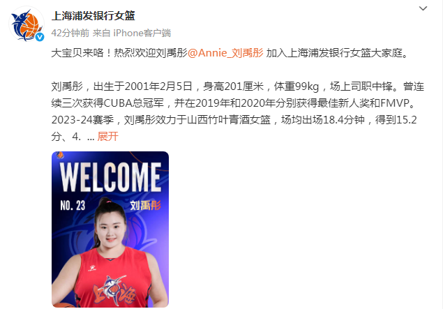 2025-26赛季,刘禹彤将身披23号战袍,代表上海女篮出战WCBA联赛,为上海而战!